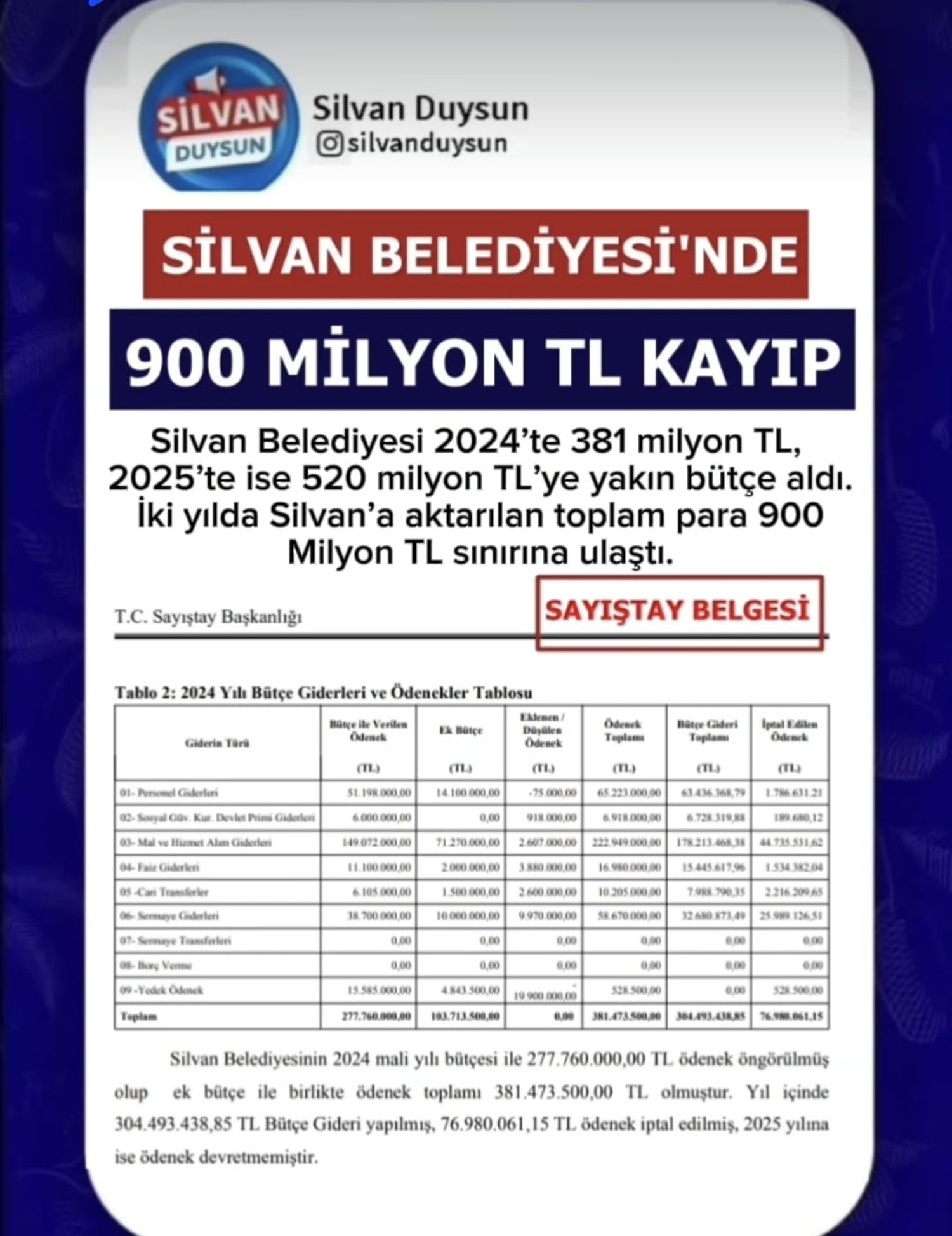 “Kamuoyunda dolaşan 900 milyon TL kayıp iddiası ciddi bir iddiadır. Bu nedenle Bilgi Edinme Yasası kapsamında Silvan Belediyesi’nden resmi gelir–gider tablosunu aldık. Yayınladığımız rakamlar tamamen resmi belgelere dayanmaktadır. Amacımız doğru bilgiye ulaşılmasını sağlamak ve kamuoyunu aydınlatmaktır.”
