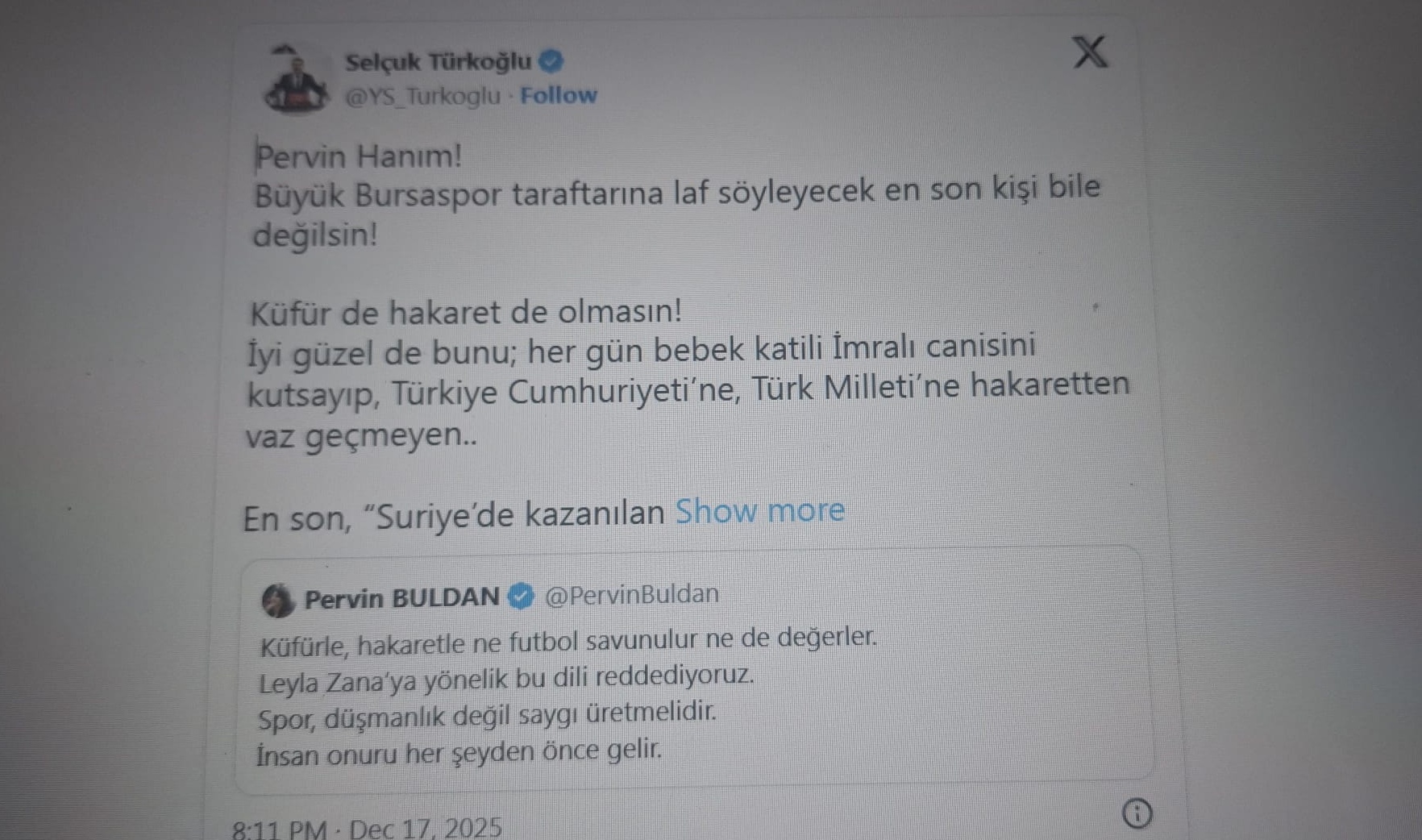 MALABADİ HABER - TFF 2’inci Lig’de mücadele eden Somaspor önceki gün Bursaspor’u ağırladı. Karşılaşmayı konuk takım kazanırken, maç sırasında Bursasporlu taraftarların Kürt siyasetçi Leyla Zana’ya ağza alınmayacak hakaretlerde bulunması infial yarattı. Çirkin hakaretler sonrası başta DEM Parti, AK Parti, CHP, HÜDA PAR, Saadet Partisi ve DEVA Partili vekiller olayı kınarken, küfürleri görmeyen İYİ Parti Bursa Milletvekili Selçuk Türkoğlu ise DEM Parti Milletvekili Pervin Buldan’ı hedef aldı.