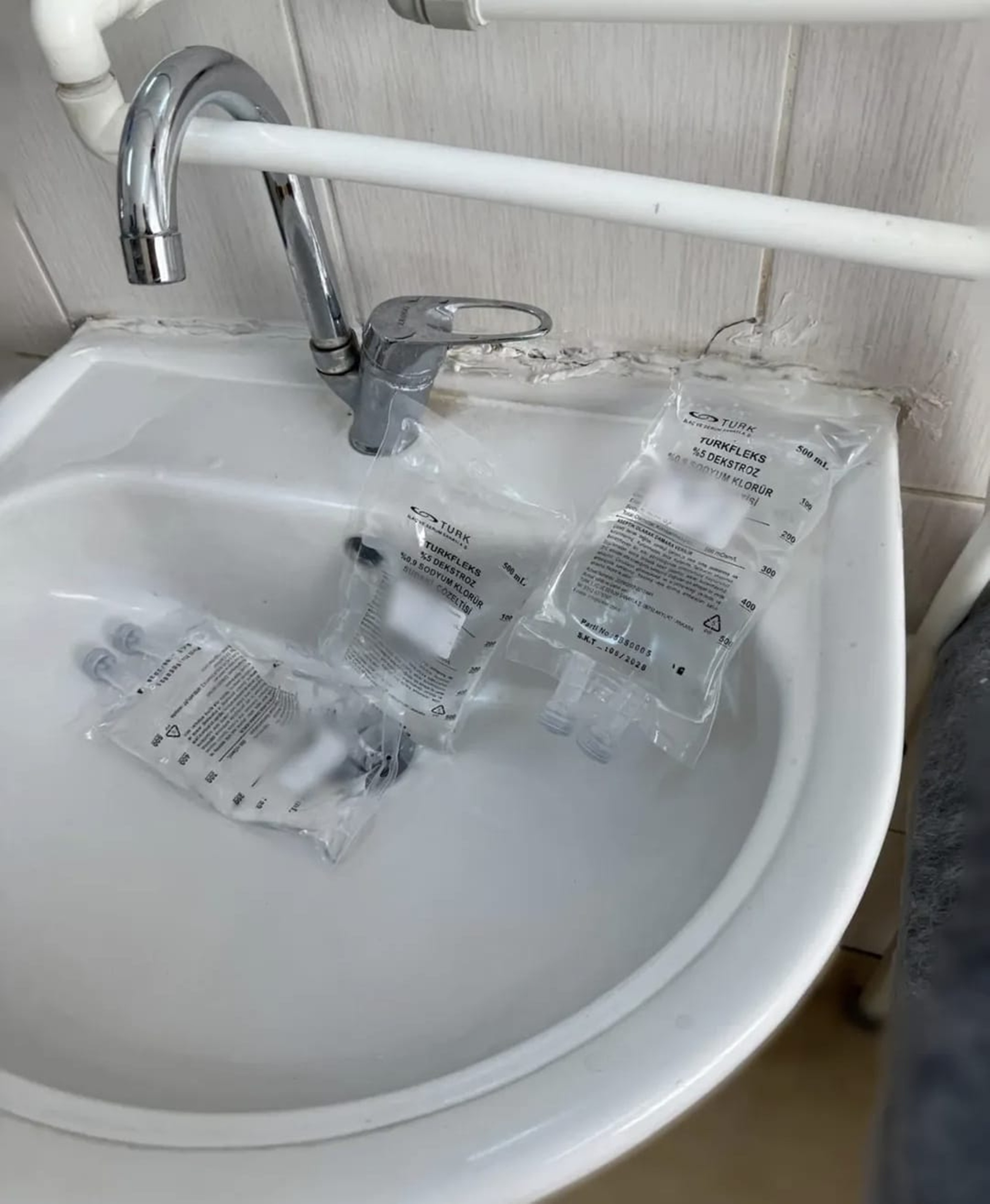 Hastanede çekilen ve lavaboya bırakılmış serum torbalarını gösteren görüntüler, durumu gözler önüne sererken, sağlık çalışanları bu uygulamanın “tasarruf adı altında” sürdürüldüğünü belirtiyor.