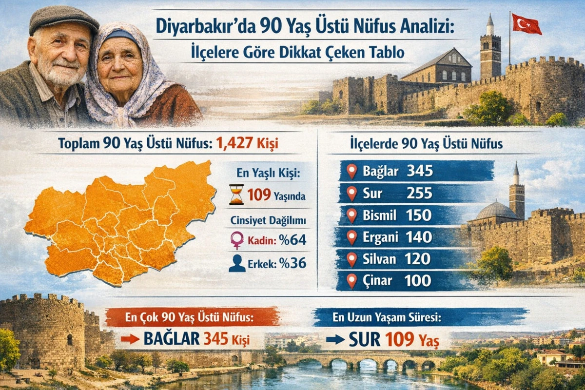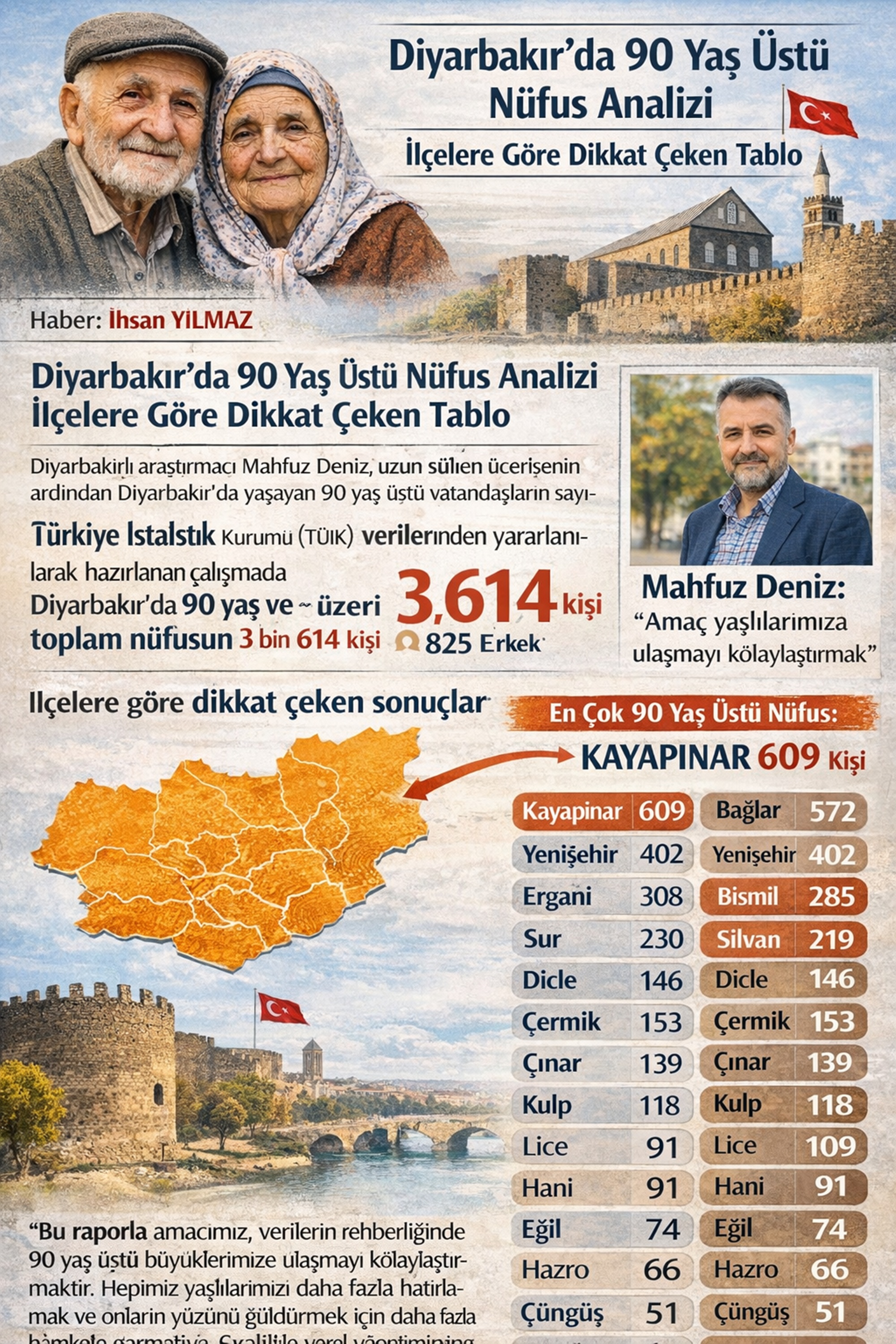 Diyarbakırlı araştırmacı Mahfuz Deniz’in hazırladığı kapsamlı çalışmada Diyarbakır’da 90 yaş üstü nüfusun 3 bin 614 kişi olduğu ortaya çıktı. Araştırma ilçelere göre dağılımı ve kadınların yüksek oranını gözler önüne serdi.