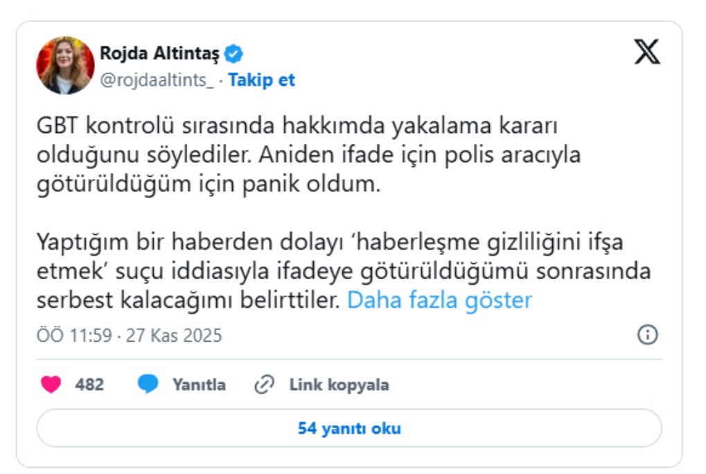 Gazeteci Rojda Altıntaş, sosyal medya hesabından gözaltına alındığını duyurdu.