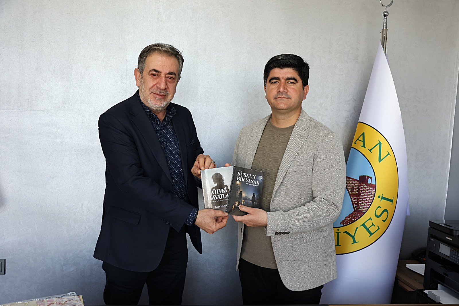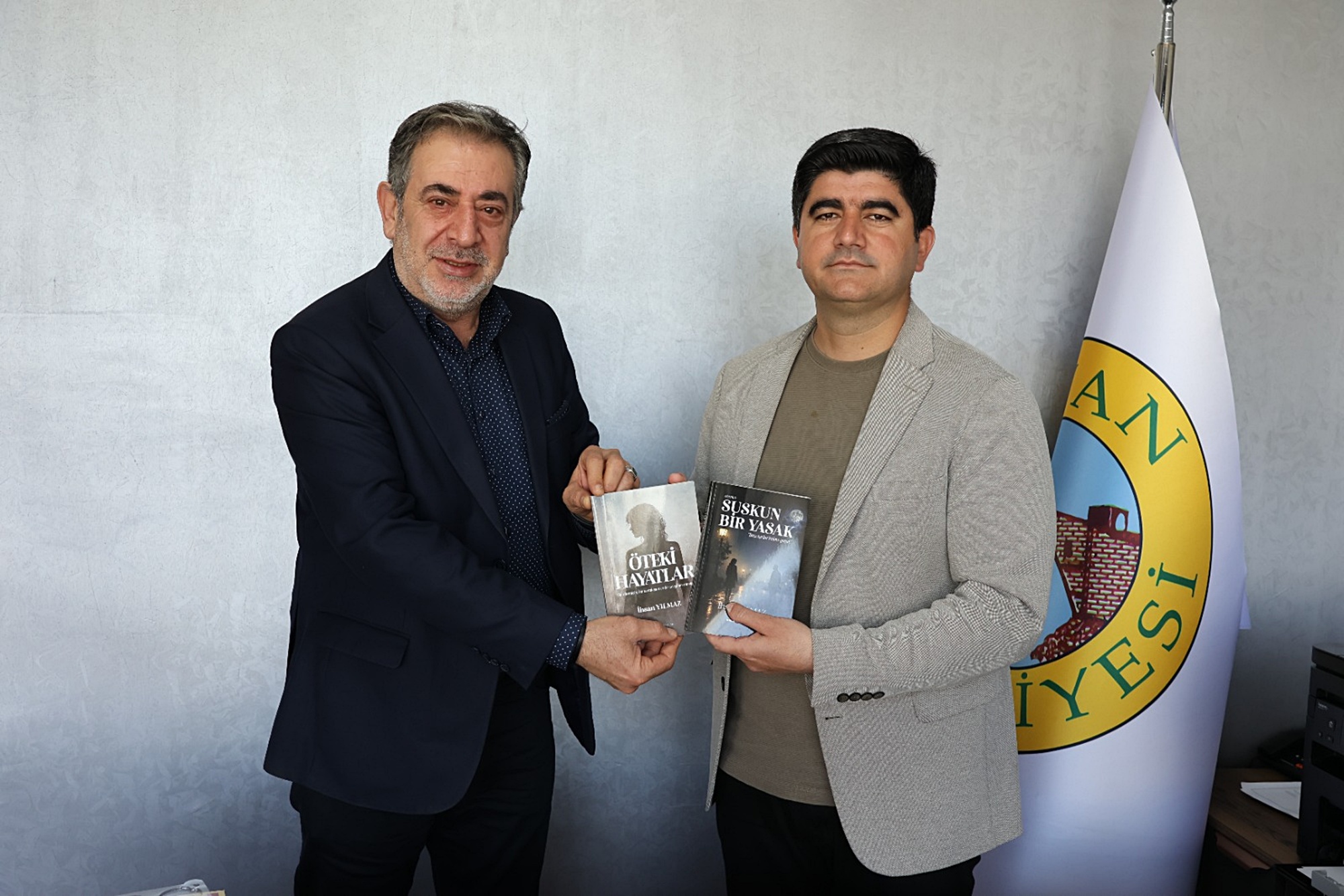 Gazeteci yazar İhsan Yılmaz, yazarı olduğu “Suskun Bir Yasak” ve “Öteki Hayatlar” adlı kitaplarını Silvan Belediyesi Eşbaşkanı Kadri Esen’e makamında imzalayarak takdim etti.