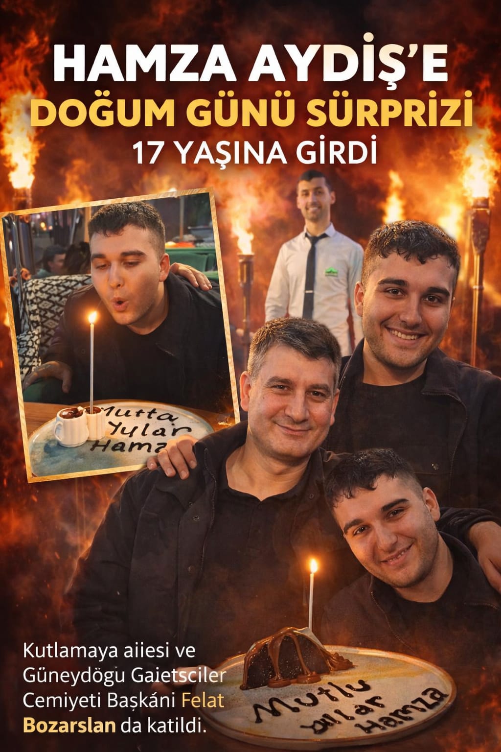 Diyarbakırlı iş insanı Burhan Aydiş’in oğlu Hamza Aydiş, Diyarbakır’daki Ali Baba’da çalışanların hazırladığı sürpriz doğum günü kutlamasıyla 17 yaşına girdi. Kutlamaya Güneydoğu Gazeteciler Cemiyeti Başkanı Felat Bozarslan ve aile yakınları da katıldı.