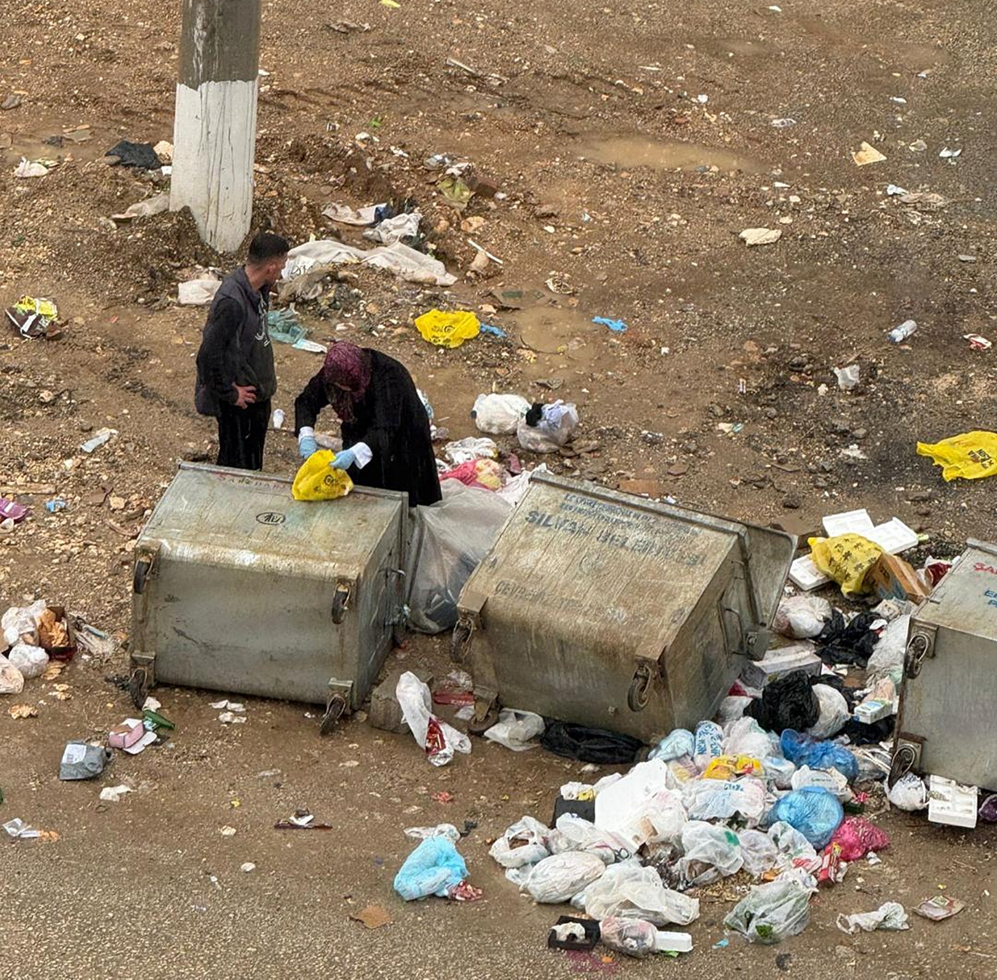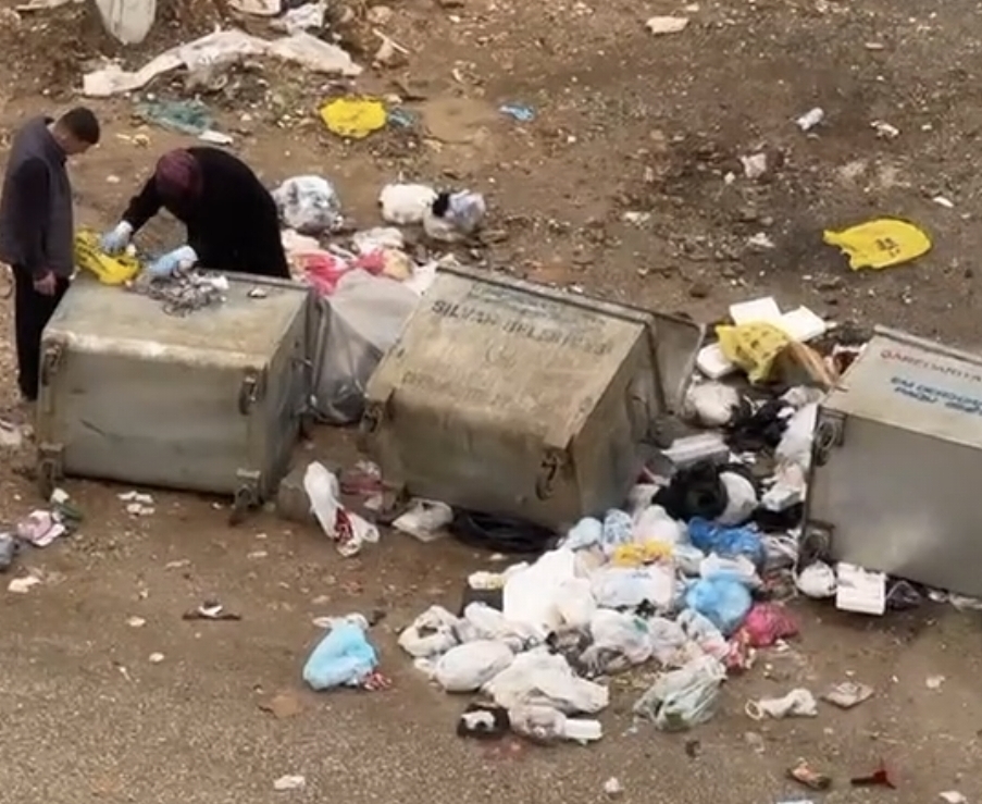 Diyarbakır’ın Silvan ilçesinde bir kadın ve bir erkek, 3 çöp konteynerini devirerek saatlerce çöpleri karıştırdı. Okul bölgesinde yaşanan olay sonrası çevre çöplüğe döndü, vatandaşlar tepki gösterdi.