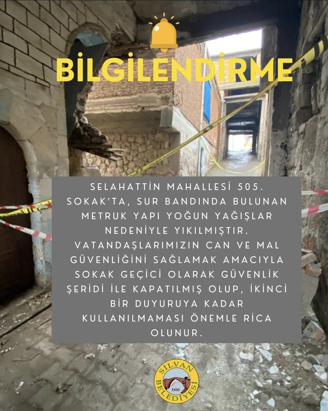 Silvan Belediyesi ise resmi sosyal medya hesapları üzerinden yaptığı açıklamada, yıkılmanın yoğun yağışlar nedeniyle meydana geldiğini belirtti. Açıklamada, ikinci bir duyuruya kadar sokağın kullanılmaması gerektiği vurgulandı.