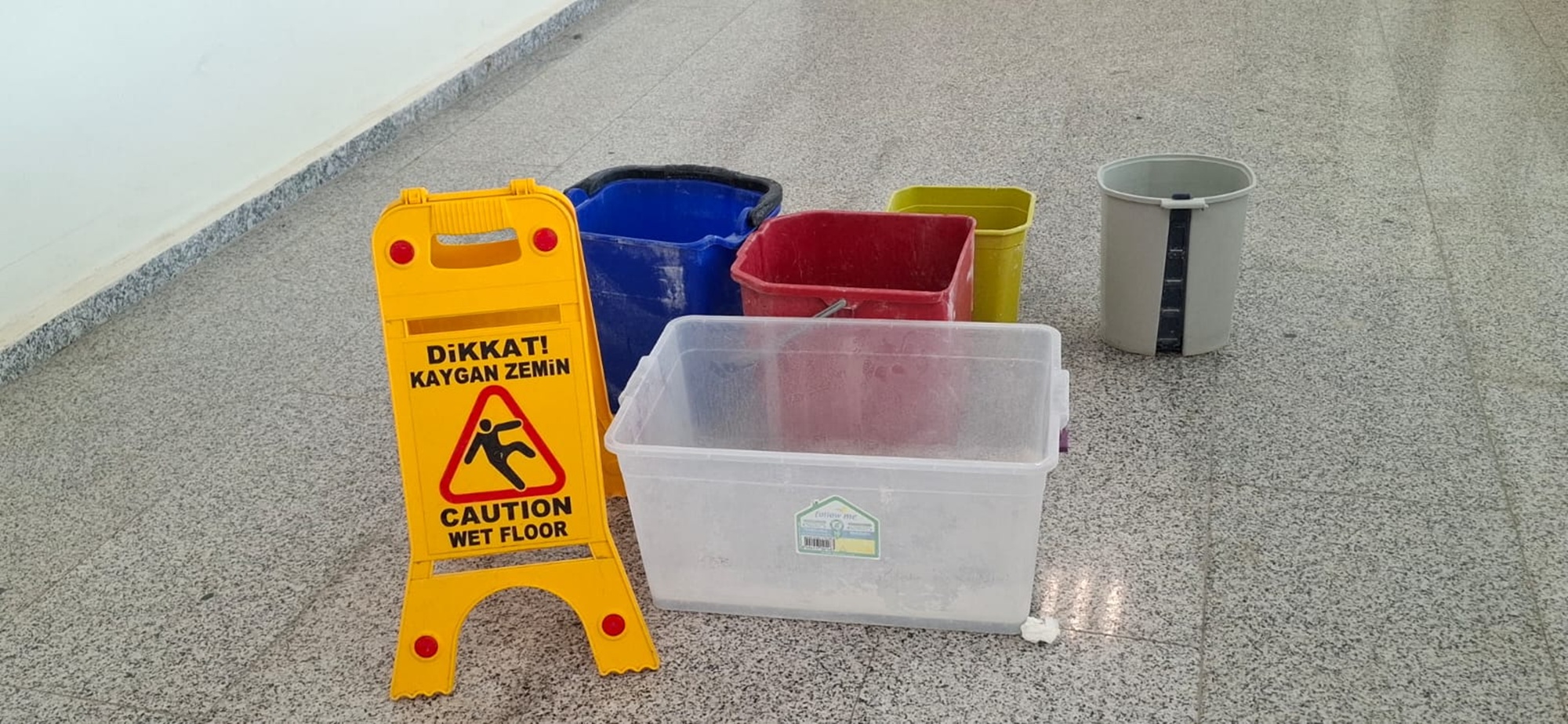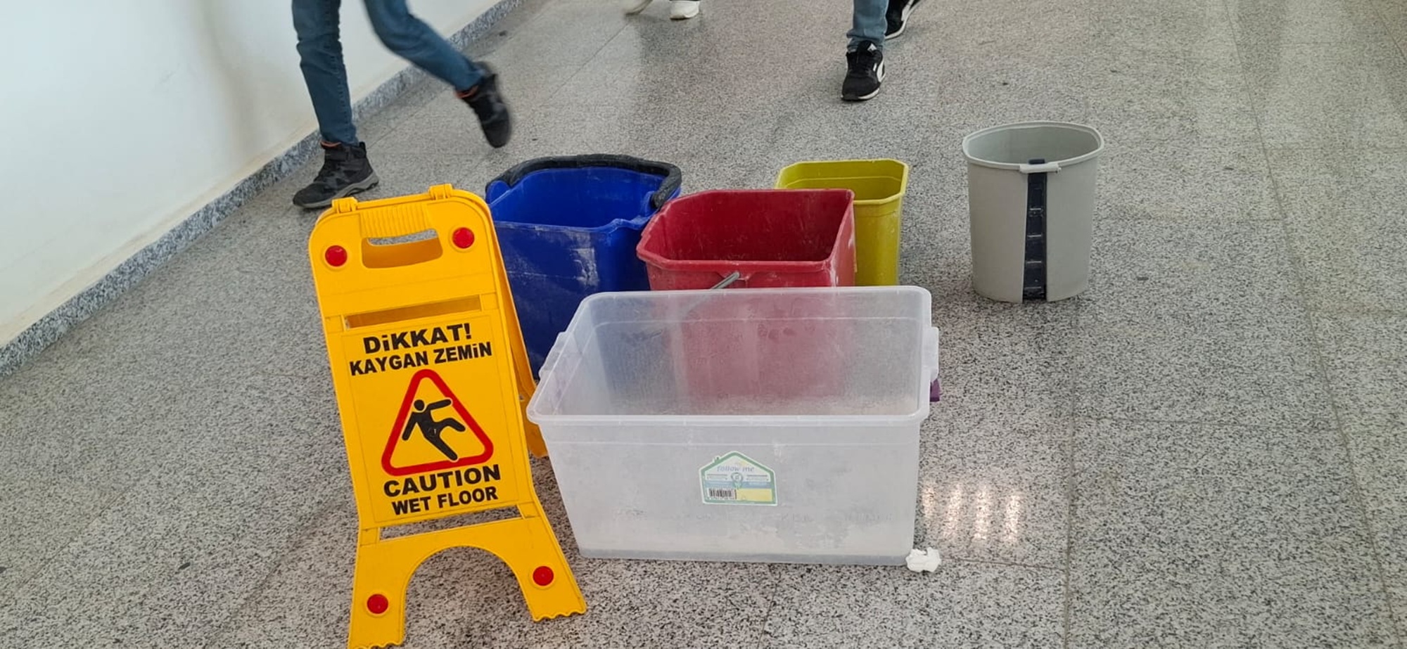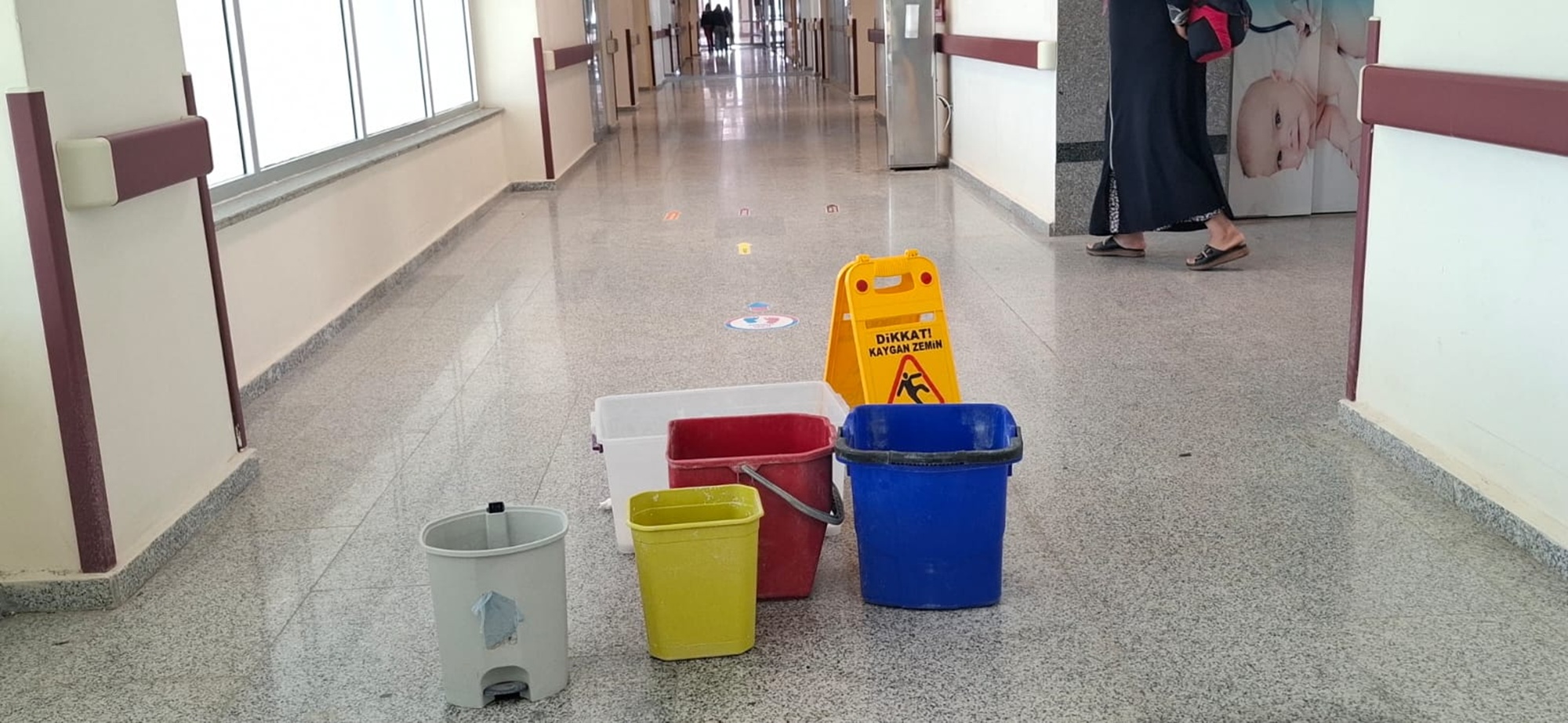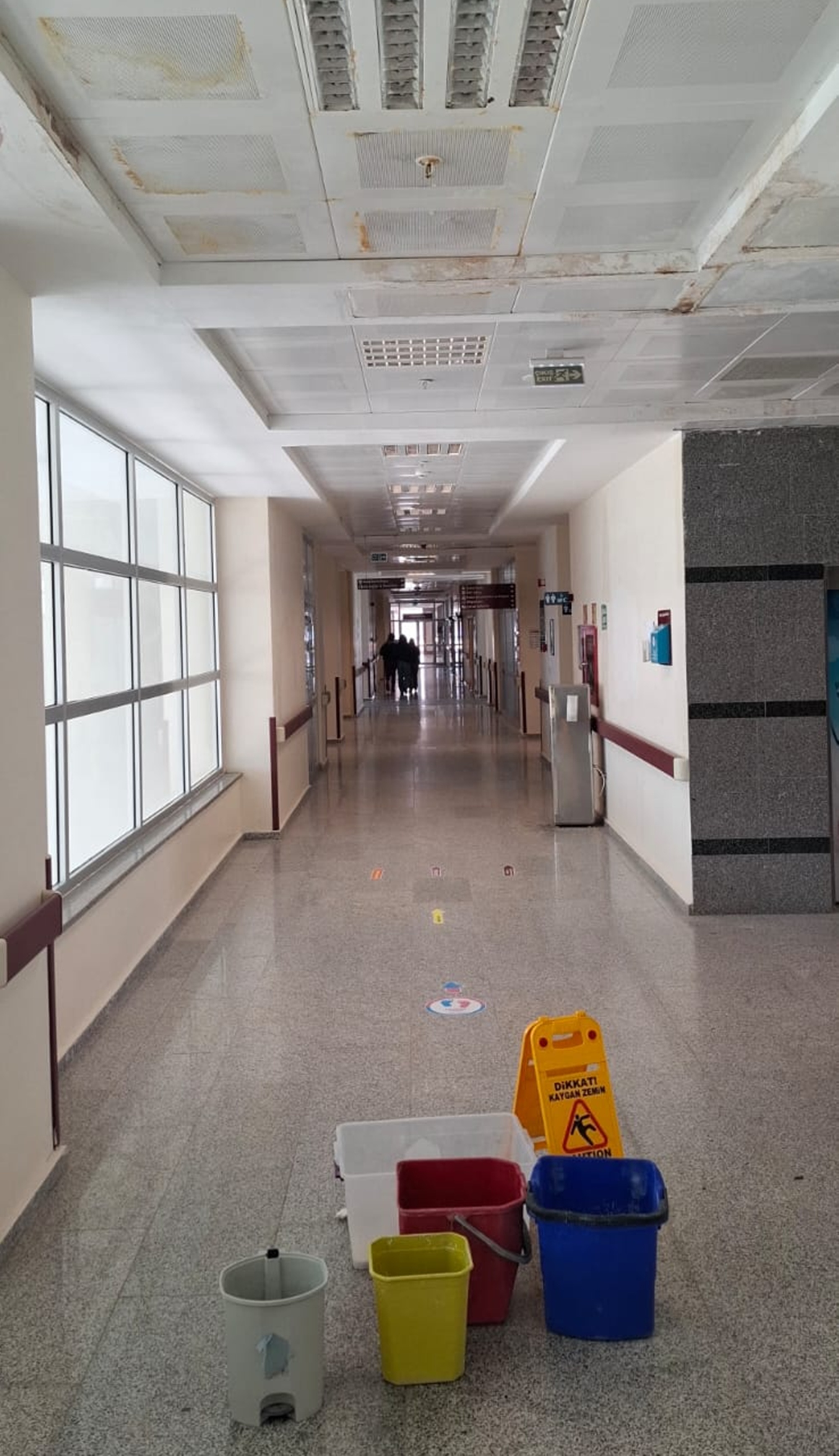 Hastanenin çeşitli bölümlerinde çekilen görüntülerde, tavandan damlayan suların kovalarla toplanmaya çalışıldığı görülüyor. “Dikkat kaygan zemin” uyarı levhalarıyla geçici önlem alınsa da, bu durum hastane gibi kritik bir kamu binasında büyük risk oluşturuyor.