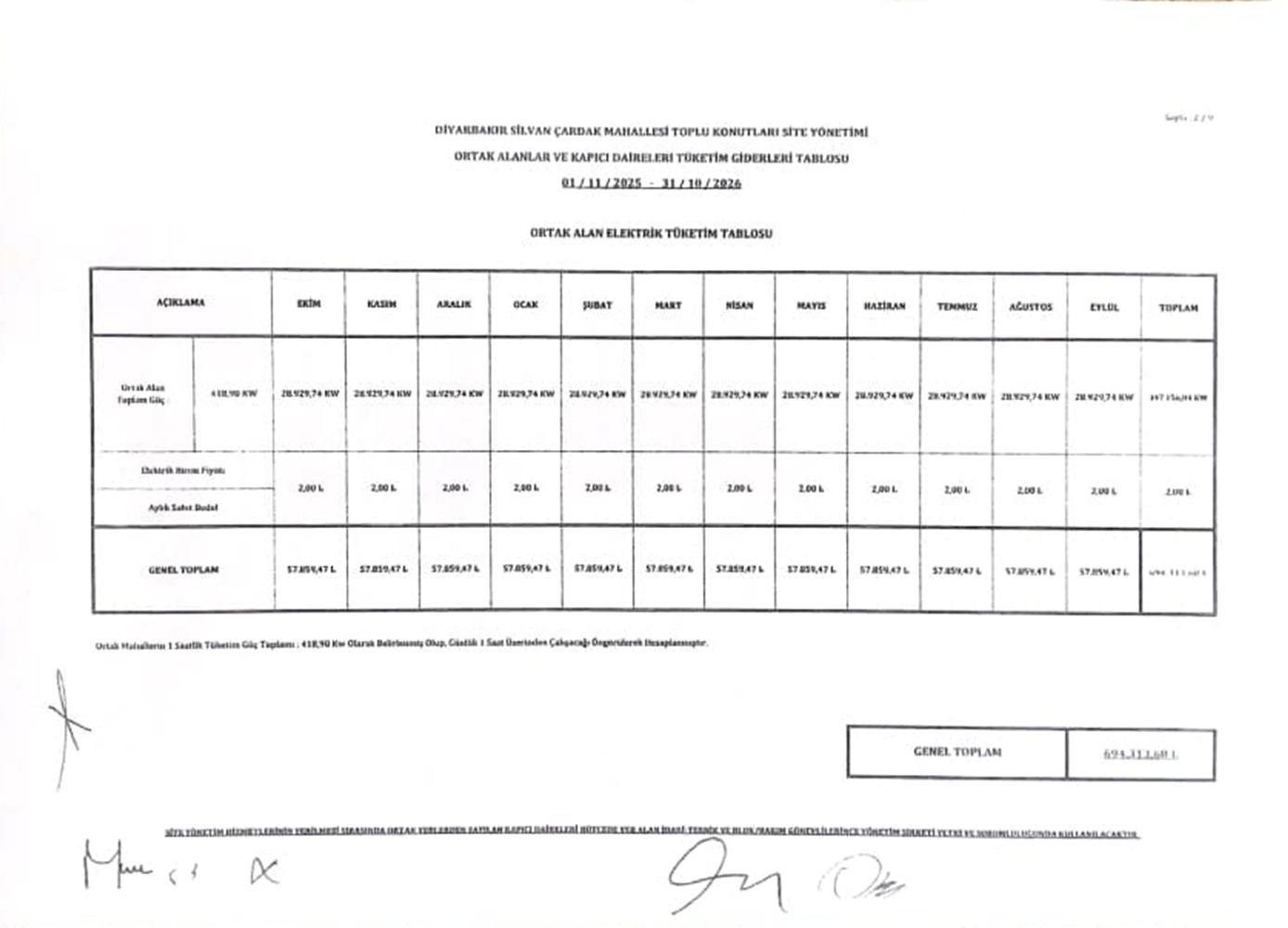 Belgelerde ortak alan elektrik tüketimi 12 ay boyunca neredeyse aynı yazılmış.