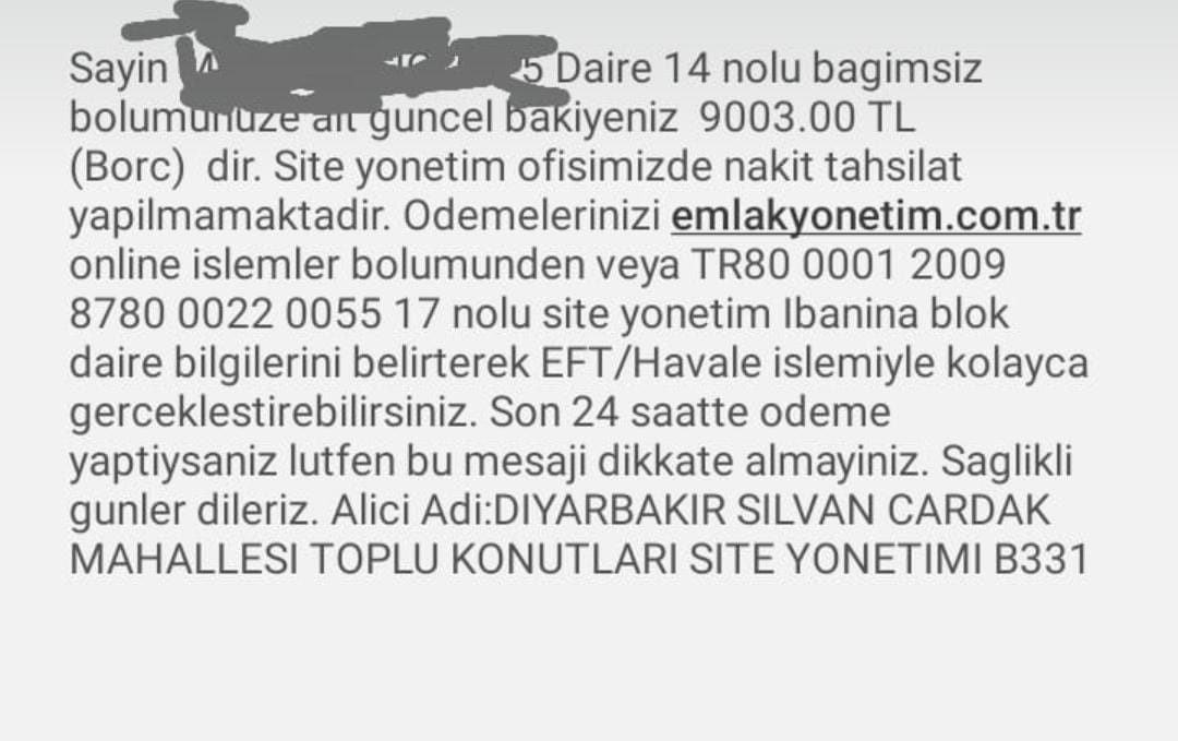 Site yönetimi, daire sahiplerine gönderdiği SMS ile kişilere tek kalemde 9.003 TL borç çıkarıldığını bildirdi. Mesajda: